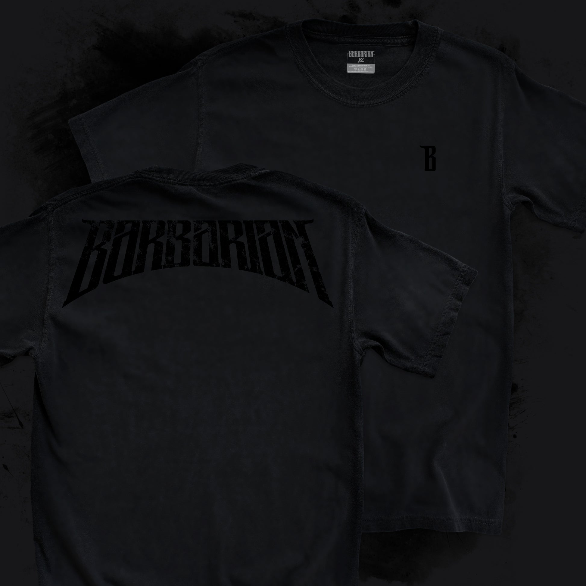 - Back — Massive arched "Barbarian" logo, distressed and oversized, printed to scale (larger shirt = larger print for maximum presence).