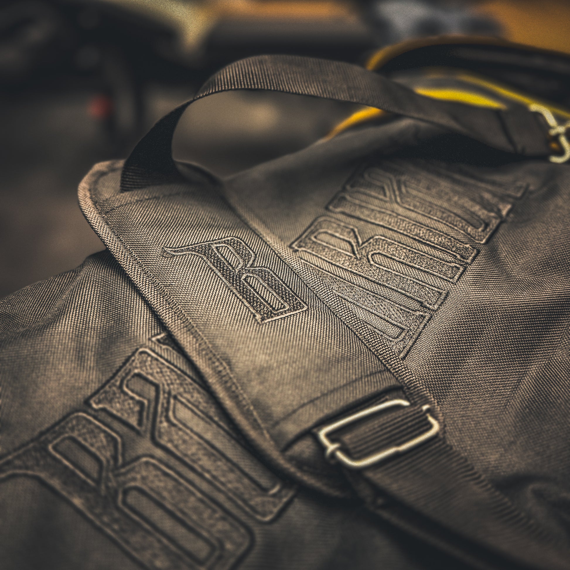 - Embroidered full BARBRARIAN logo on the top zip flap and front pocket; signature "B" icon on pockets, D-ring, and shoulder strap