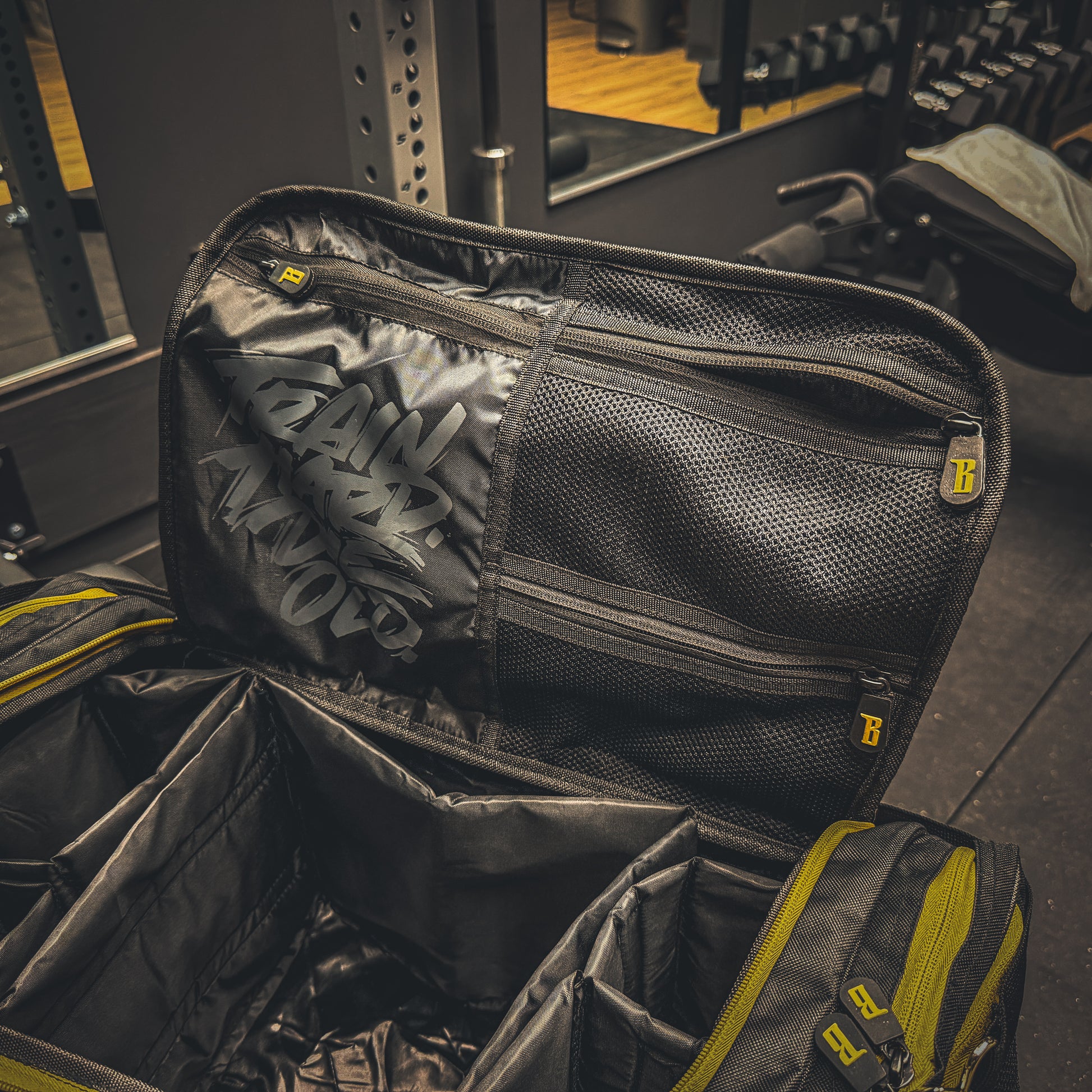 The massive main compartment swallows your favorite training accessores, clothes, shoes, and extras with ease, featuring modular Velcro-removable dividers for custom organization. Two dedicated pockets in the dividers fit our American-made shaker and 64 oz Vessel bottle perfectly (keeping potential leaks contained), and they play nice with third-party tumblers or supplements too.