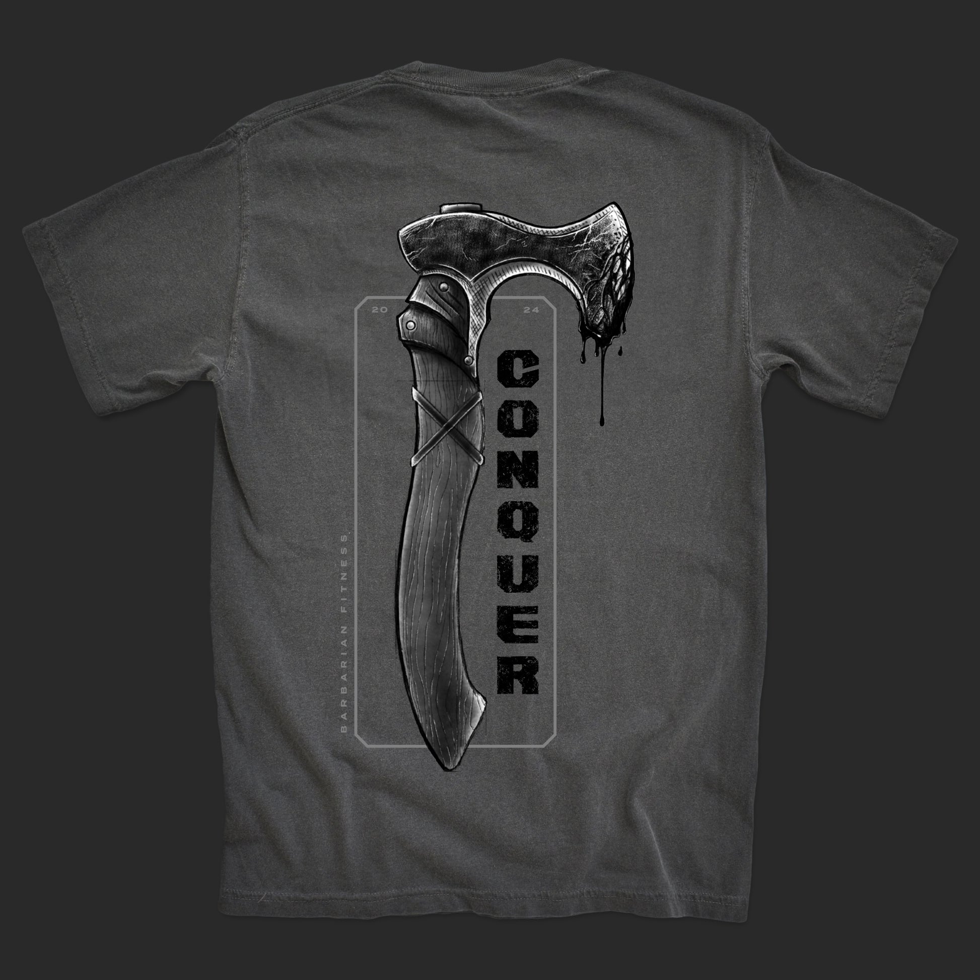 Our August 2024 drop features a detailed battle axe with a weathered blade and handle - hand-drawn by our founder, JR. This shirt embodies the gym spirit of overcoming challenges and pushing physical limits. The axe symbolizes strength and determination, reflecting the relentless effort required to conquer fitness goals. The word "CONQUER" serves as a rallying cry, motivating gym-goers to dominate their workouts and personal barriers.