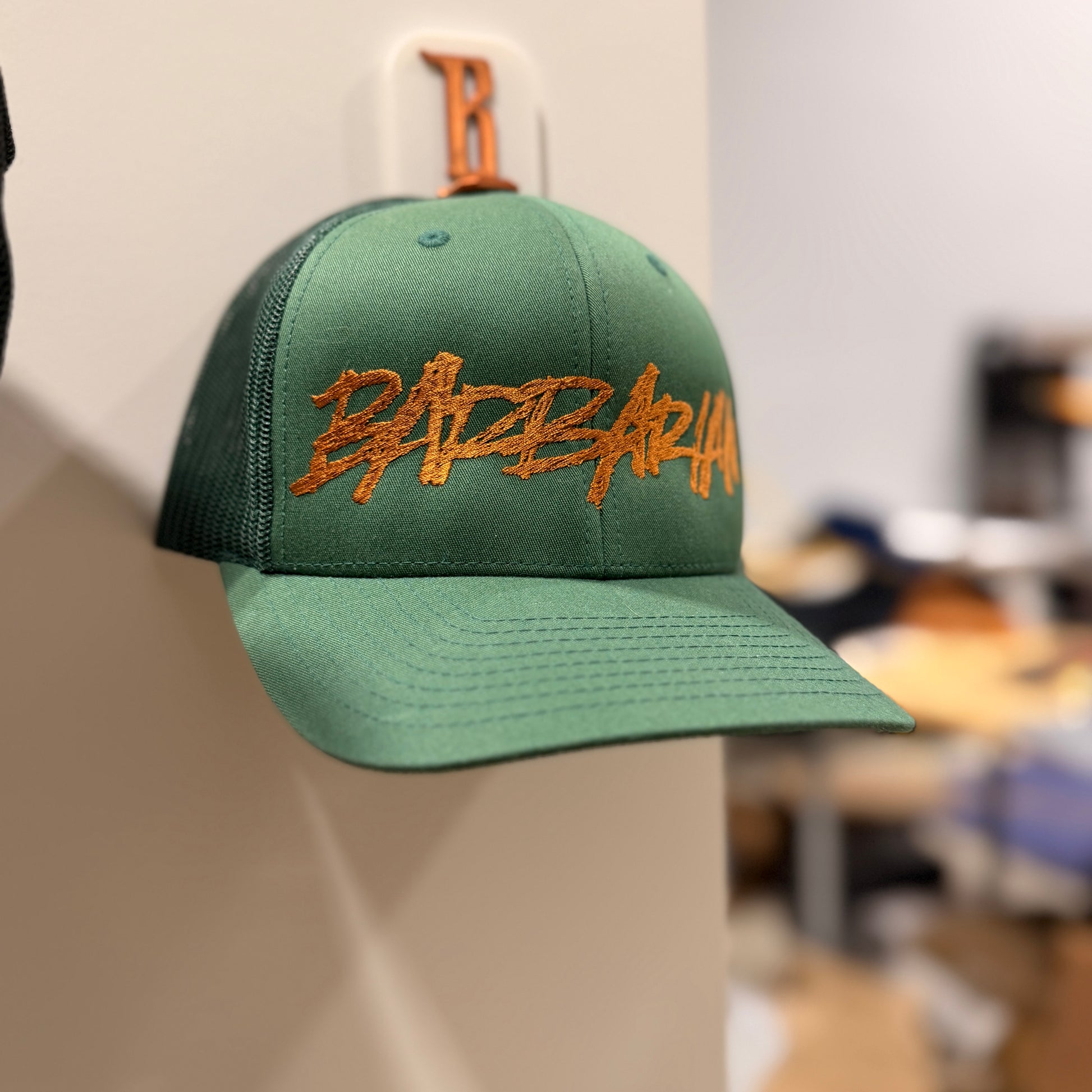 By popular request, Yupoong truckers have also been added to our lineup with more colors coming! It's decorated an oversized, hand-lettered "BARBARIAN" across the front in either sage or copper.